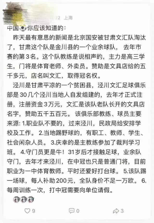 泾川文汇队来自甘肃省平凉市泾川县,这场在外人看来是“以弱胜强”的胜利引发大众持续关注。随着#甘肃县级队足协杯淘汰北京国安#话题登上微博热搜,“泾川文汇前锋是开牛肉面馆的,后卫是卖水果的,门将是老师……”一则关于球队成员身份的传言在互联网流传甚广。