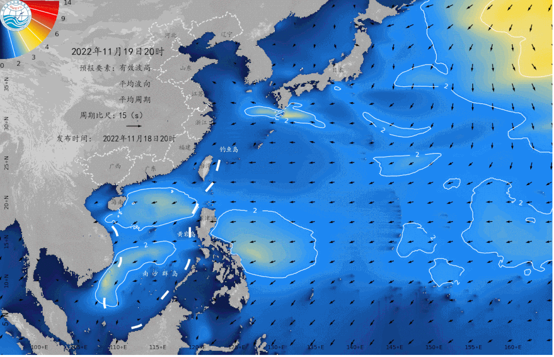 南海北部、中部、巴士海峡有2.2到2.7米的中浪到大浪区;