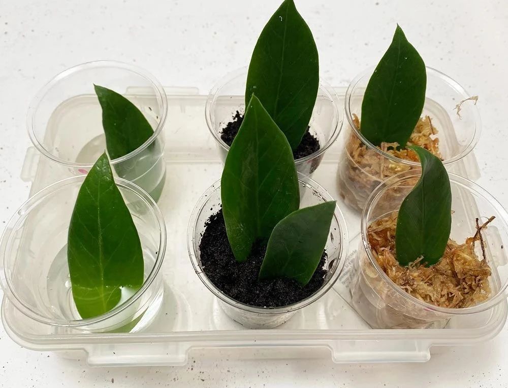 金钱树叶插繁殖可选择水培或土培,还可以选择水苔包裹,都是要保持湿润,长根后逐渐给一点散射光。