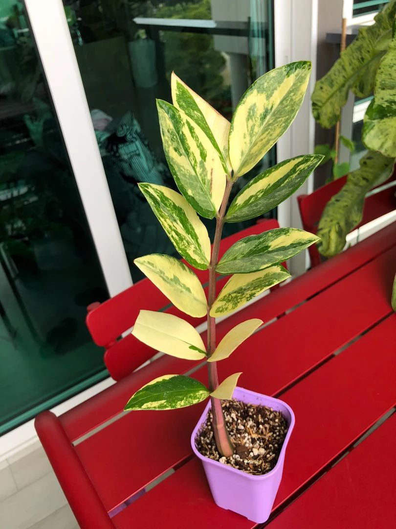 黑叶雪铁芋(Zamioculcas Zamiifolia Raven) 锦叶金钱树(Zamioculcas zamiifolia variegata) 金钱树也有很特别的品种,比如黑叶雪铁芋(黑叶金钱树)、黄锦金钱树和白锦金钱树等。 J) \- w# i5 ~* W2 e/ }3 H