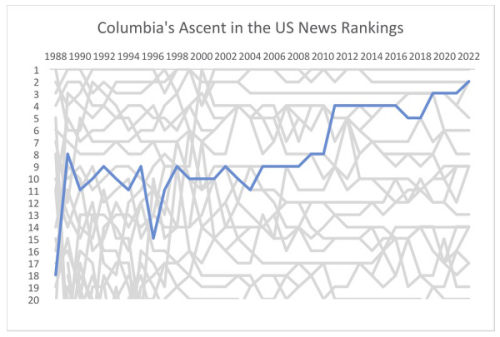 ) A Y$ {9 J( f/ \5 H 哥大近年来的全国排名稳步上升。图源:迈克尔·萨迪斯个人主页