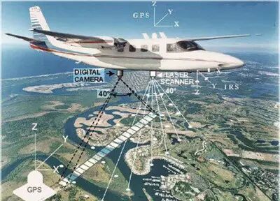 1 ^7 P3 K9 A% e: p/ N9 x1 O 激光测深(Airborne LIDAR-Light Detection And Ranging)—20世纪70年代发展,90年代逐渐成熟的最新测深技术。通过发射两束不同波长的激光脉冲射向水面,红光在水面被直射反射回,而蓝绿光在穿透水底后被海底反射回,这两个光束的接收时间差即为水的深度。