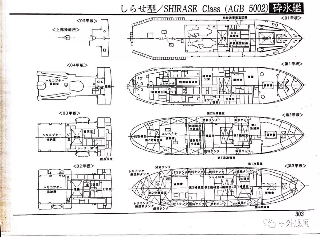 新白濑号船长138m,水线长126m,型宽28m,吃水9.2m,标准排水量12650吨,满载排水量22000吨,在继承老白濑船型的基础上体型大了一圈。作为一型以南极科考观测为主要任务的破冰船,新白濑号采用了倾斜角为21°的高强度不锈钢破冰船首,可以以3节航速连续突破1.5m(含积雪)的冰层,达到了国际船级社协会(IACS)颁布的《极地船级要求》中PC-5以上的抗破冰能力(相比较我国的雪龙号只勉强具备PC-6的破冰等级)。除了连续破冰和通过船首重力破冰外,新白濑号在船首还安装有融雪水(经加热过的海水)喷洒孔,当遇到超过最大连续破冰厚度,但又没有必要使用重力的冰层,新白濑可以通过喷洒热水,减小舰首方向冰层厚度后再进行连续突破,大大提高了破冰效率。 ( O' j$ X" M/ o5 [
