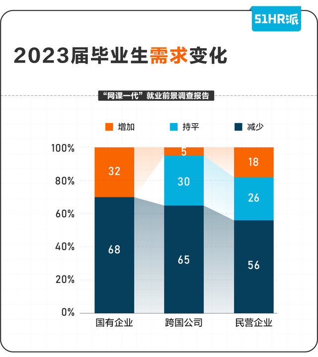 ! X5 @7 C4 c+ l3 e- H4 \/ j% ]9 H3 Y+ \ 相比2022届,超过一半的企业会减少对2023届的招聘,其中跨国公司最多,占比达61%,其次是国有企业(59%)、民营企业(56%);就增加的比例而言,国有企业最多,占比为23%,其次是民营企业(18%)、跨国公司(6%)。