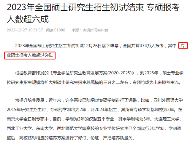 ! L; E+ J+ l7 p( W" S; h8 X/ ?; Y 近期央视新闻报道:2023年全国硕士研究生招生考试初试落下帷幕,全国共有474万人报考,其中,专业硕士报考人数超过6成。 ! }. X0 `+ \ f: ?+ A