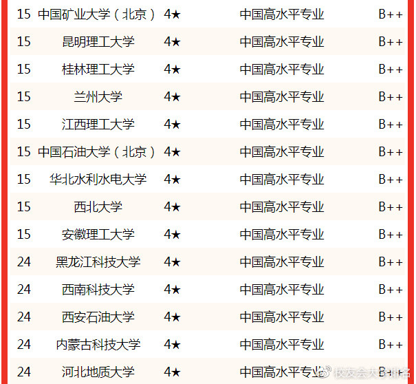 p; n1 y% e; ]# f: D 在最新校友会2022中国大学地质工程专业排名(研究型)中,中国地质大学(武汉)荣膺2022中国七星级专业(7★),迈进世界知名高水平专业、中国顶尖专业行列。福州大学、成都理工大学、中国矿业大学、中南大学、长安大学、吉林大学荣获2022中国六星级专业(6★),进入世界高水平专业、中国顶尖专业行列。西安科技大学、河海大学、同济大学、南京大学、中国地质大学(北京)、西南交通大学、山东科技大学荣得2022中国五星级专业(5★),跻身世界知名专业、中国一流专业行列。