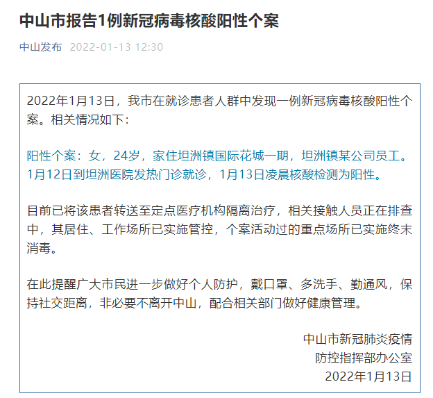 1月13日,中山市在某医院发热门诊发现1例新冠病毒核酸阳性个案,为中山市坦洲镇某公司员工,家住坦洲镇国际花城一期。