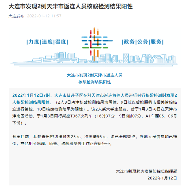 1月12日,大连市报告2例新冠病毒核酸阳性个案,2例个案系大学生朋友,曾于1月3日-8日在天津市津南区活动,1月8日返回大连。 - _ p- l( j; s) [
