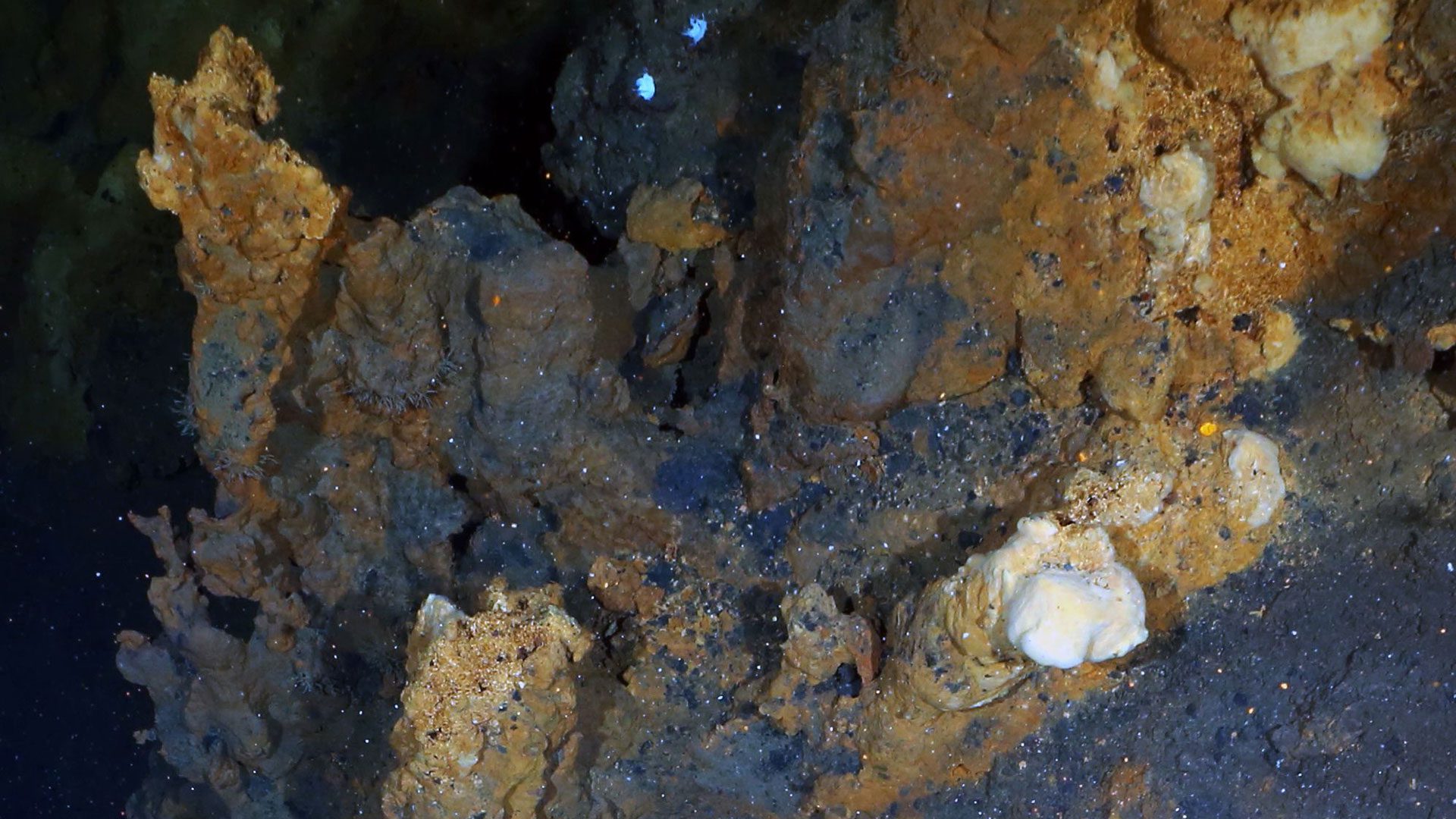 1 F2 v6 M) [& T0 L0 g在北冰洋的Gakkel Ridge Aurora热液场,俯瞰着来自大量矿藏的石笋般的热液烟囱。一些烟囱顶部附近的淡奶油色“斑点”代表了一种可能存在于土星卫星土卫二上的地热微生物生命。(图片来源:©阿尔弗雷德·韦格纳研究所)