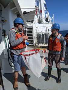 ( T O- t' M" G$ G, V2021,本杰明·范·穆伊(Benjamin Van Mooy)(左)和亨利·霍尔姆(Henry Holm)在奋进号(Endeavor)的甲板上,在一次调查浮游生物产生的脂质的巡游中,讨论了采样策略。图片来源:Helen Fredricks/©Woods Hole海洋学研究所