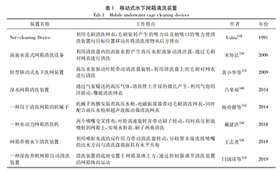2 L8 l# E5 a" d0 a- K# x+ W4 z' t! ~[宋协法]等设计了通过高压水泵产生高压水流,高压水流产生的反作用力驱动圆盘及毛刷旋转以对网衣进行清洗。[黄小华]等利用喷嘴产生的高压水射流驱动叶轮旋转进而带动清洗盘转动来实现对网衣的清洗。[戴建洪]通过交叉排布的2个喷嘴驱动叶轮高速旋转并带动毛刷转动,同时利用高压水射流压力和毛刷,实现对网箱的双重清洗。这种类型的移动式网箱清洗装置结构简单、操作方便,工作人员手持操纵杆即可实现对网衣的移动式清洗,有效清除网衣上的污垢和污损生物,极大地减轻工人的劳动强度,提高了清洗效率,但在设备的可操作性及自动化方面还有待于进一步提高。日本的富士公司为了减轻渔网清洗作业的劳动强度,研制了鼓轮式自动渔网清洗机,利用鼓轮转动时产生的离心力使附着在网衣上的贝壳和海藻脱离。常见移动式水下清洗装置如表1所示。