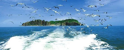 7 ]: L* L" J% W0 Q: @8 H& G成群海鸥飞翔在荣成市海驴岛的碧海蓝天中。 . P2 w5 A* T, L+ e