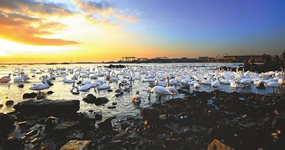 美丽的白天鹅在威海烟墩角天鹅湖游弋嬉戏。中共山东省委海洋发展委员会办公室供图+ U8 c" e; B$ p1 g0 c