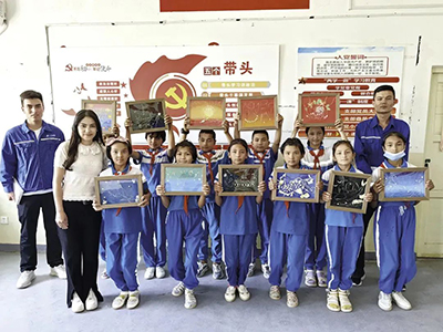 新疆喀什英吾斯坦乡中心小学的小朋友收到上海大朋友用鱼骨制成的海洋图画。上海海洋大学供图7 U- ?: U' m/ Y) x1 j+ U/ h