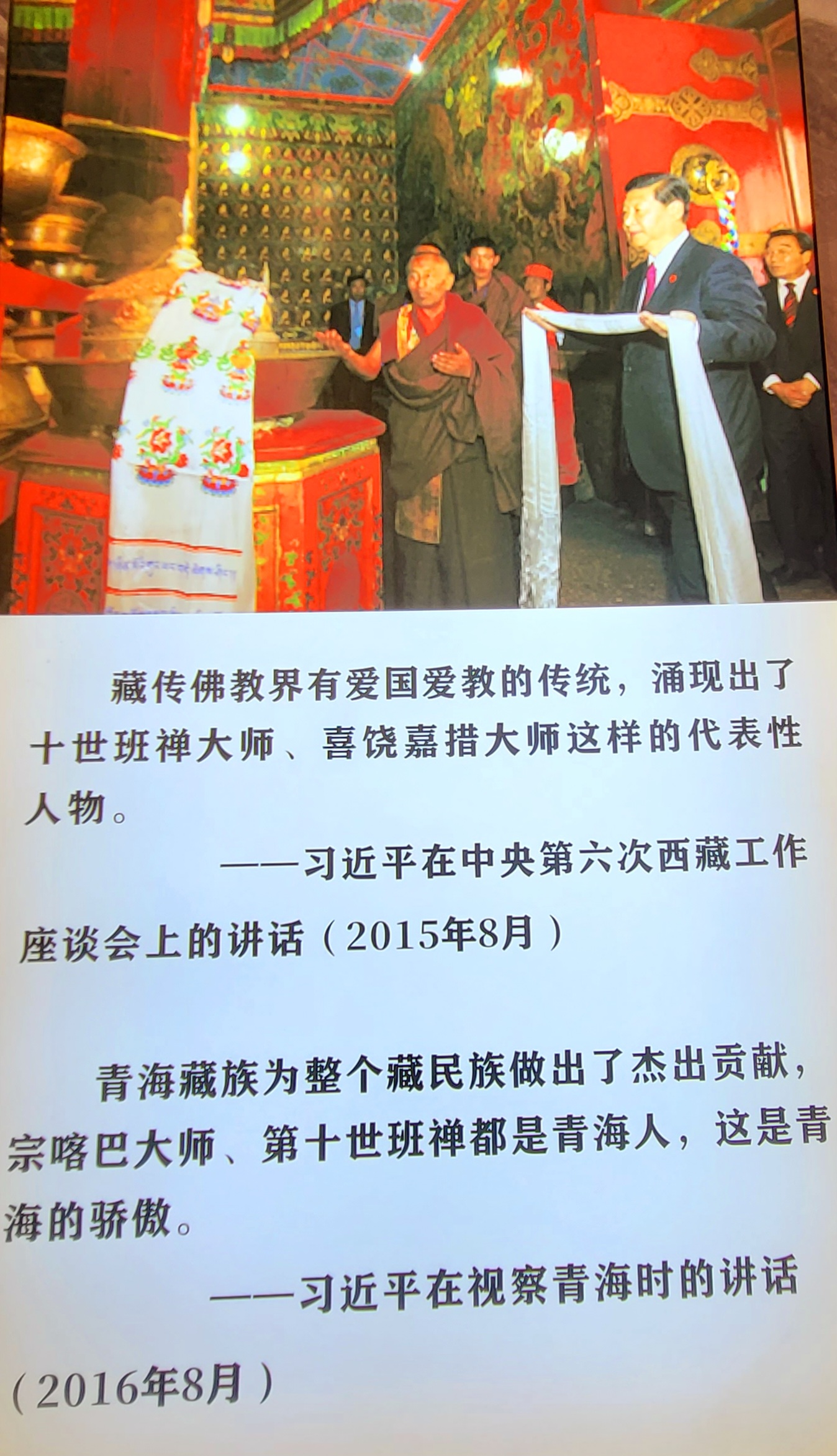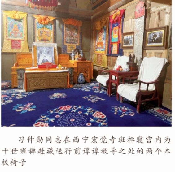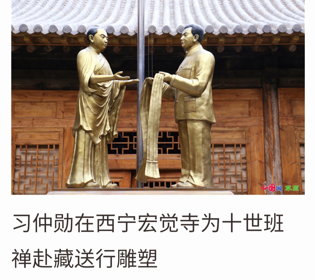 8 {; C$ p6 r0 }9 d; U+ t1 ~3 G12月19日,习仲勋在西宁宏觉寺会见了青海省党政军代表和来自青海、甘肃各地区、各大寺院的活佛、高僧大德、地方千百户、僧俗群众,并主持了为十世班禅进藏的送行仪式。此后十世班禅一行历经半年多跋山涉水,于1952年6月30日返回历代班禅驻锡地、格鲁派六大寺之一、位于西藏日喀则的扎什伦布寺,登上了历代班禅大师的宝座,举行了盛大的坐床仪式。今天的宏觉寺里,当年习仲勋与十世班禅会面的房间依然保留着原样,习仲勋为班禅献上哈达祝他一路顺风的塑像将这个西藏和平解放过程中的重要时刻永久定格。' ]9 m- t2 t9 I8 B# J! g3 K" z