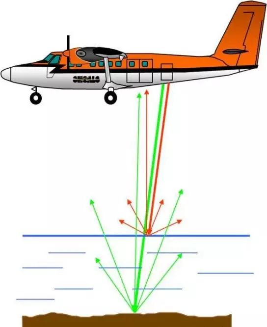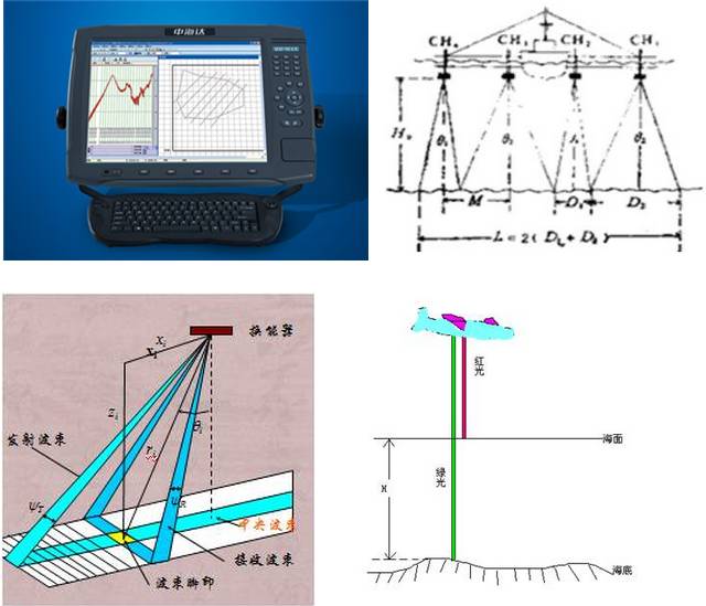 4 G- m2 S( n3 a5 x+ x 激光测深(Airborne LIDAR-Light Detection And Ranging)—20世纪70年代发展,90年代逐渐成熟的最新测深技术。通过发射两束不同波长的激光脉冲射向水面,红光在水面被直射反射回,而蓝绿光在穿透水底后被海底反射回,这两个光束的接收时间差即为水的深度。