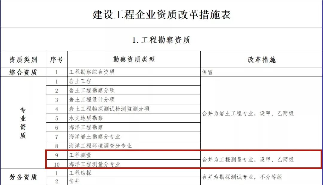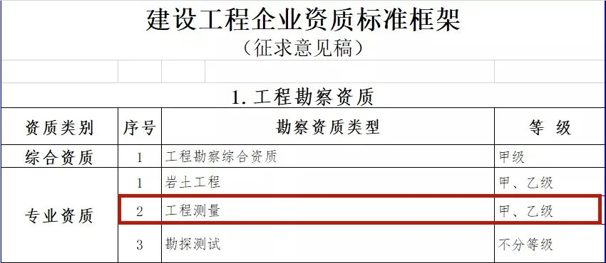 2 f& t. z* u: C" v0 f 根据征求意见稿,工程勘察资质保留综合资质。将4类专业资质及勘察劳务资质整合为岩土工程、工程测量、勘探测试等3类专业资质。专业资质等级压减为甲、乙两级(勘探测试专业资质不分等级),原丙级资质并入相应专业乙级资质。其中,原工程测量和海洋工程测量分专业合并为工程测量专业资质,设甲、乙两级!