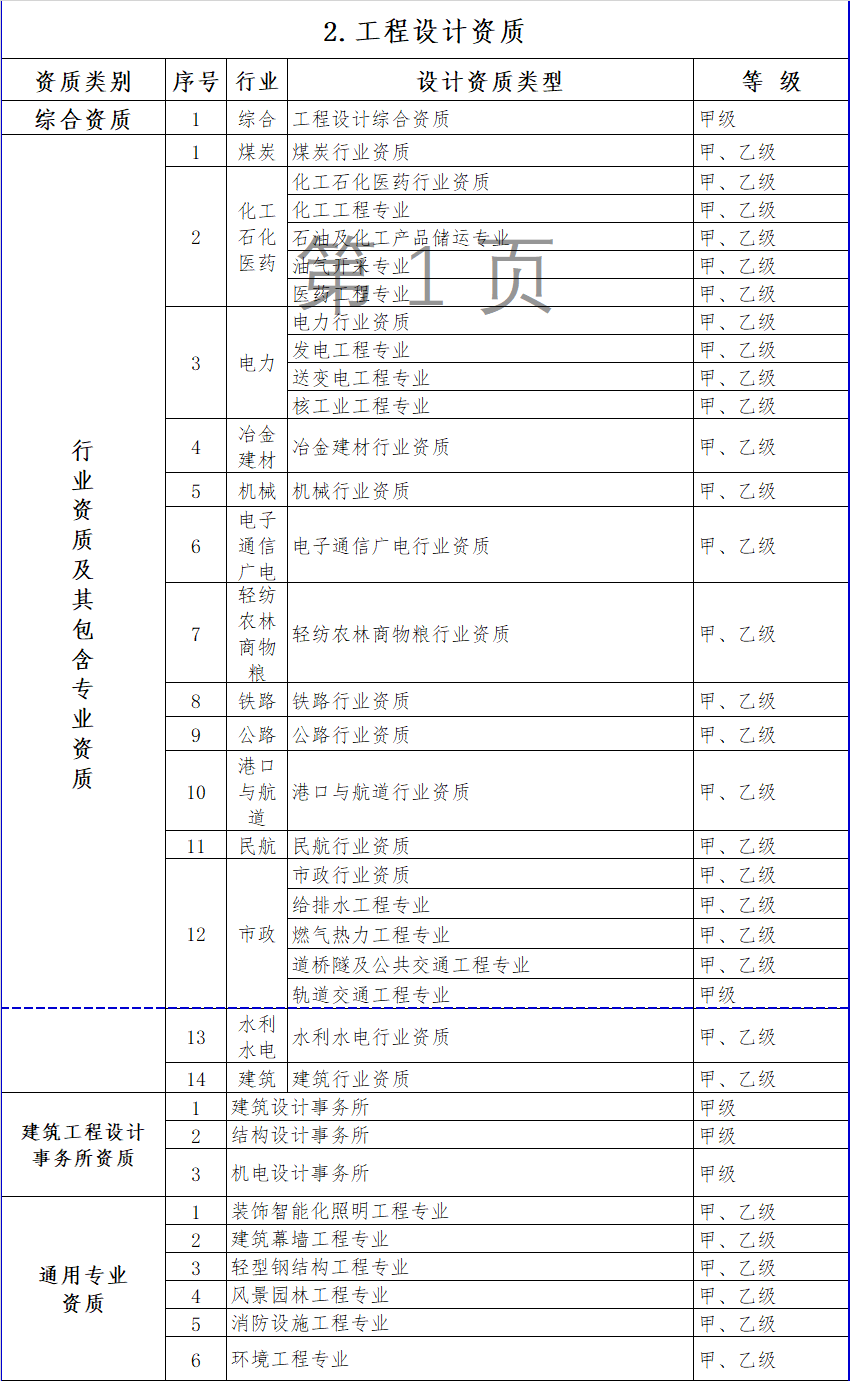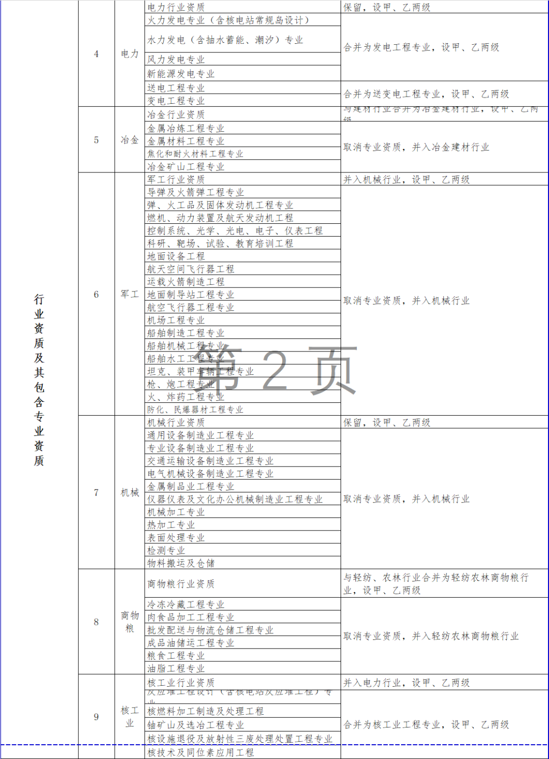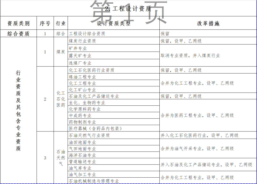 1 c- B: q! J5 j& Q (二)工程设计资质。保留综合资质。对部分行业资质进行整合,其中,冶金行业与建材行业合并为冶金建材行业资质,轻纺行业、农林行业、商物粮行业合并为轻纺农林商物粮行业,电子行业、通信行业、广电行业合并为电子通信广电行业,石油天然气行业并入化工石化医药行业,军工行业并入机械行业,核工业行业并入电力行业,资质等级压减为甲、乙两级,原丙级资质并入相应行业乙级资质。取消海洋行业及专业资质,相关企业可以换发相近行业资质。整合原化工石化医药、石油天然气、电力、市政行业中的专业资质,资质等级压减为甲、乙两级,原丙级资质并入相应专业乙级资质;取消其他行业的专业资质,并入相应行业资质,原甲、乙级专业资质并入相应等级的行业资质,原丙级专业资质并入乙级行业资质。将专项资质调整为通用专业资质,取消环境工程专项资质的5个专项类别,整合为环境工程专业资质,资质等级压减为甲、乙两级,原丙级资质并入相应专业乙级资质。保留3类事务所资质。 6 C n$ ~$ ?! \' M
