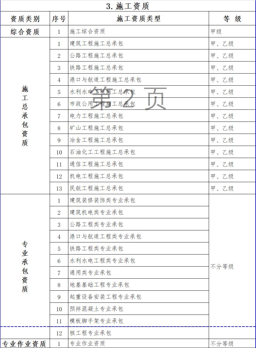 保留地基基础工程、起重设备安装工程、核工程等专业承包资质;将原专业承包资质整合为建筑装修装饰类、建筑机电类、公路工程类、港口与航道工程类、铁路工程类、水利水电工程类、通用类专业承包资质;专业承包资质不分等级。