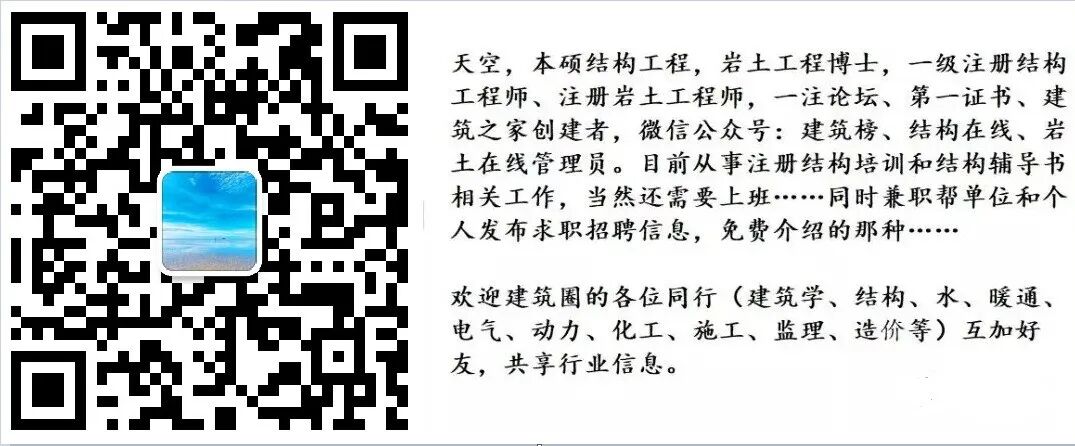 + B# a8 Z7 Y; l+ ? 道路基础群:941354547道路专业群:926664736我是建筑榜的天空,一名结构设计师,在工作之余我会写写建筑行业新闻,大部分情况下是专注于建筑行业考试信息的分享,如果你喜欢,欢迎关注。 天空微信(已经加过的不需重复加) 看完了,支持下,留个念,点“在看”* L" S0 p' n7 p5 ^