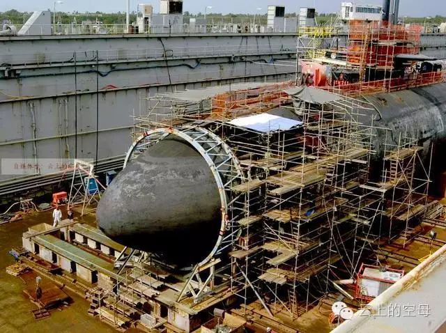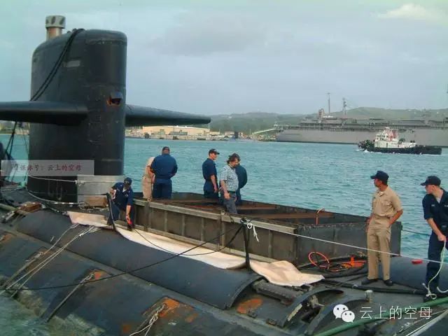 停靠在浮船坞旁边的旧金山号攻击型核潜艇,虽然其位置比较远,但仍然能够看到其水线上被损毁的部分。相撞之后,声呐罩的有一部分挂在了艇体上,于是派遣潜水员对其进行了切除。 # l {0 v& M3 n k