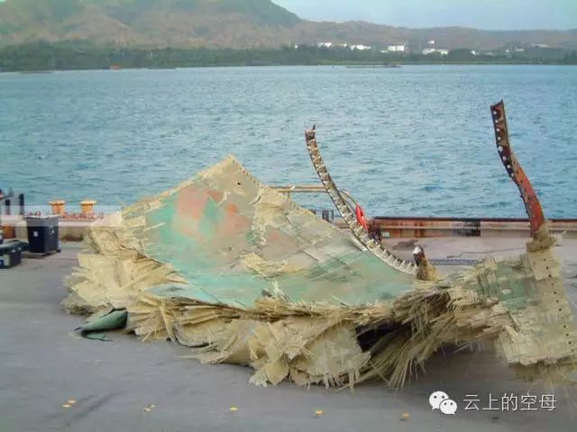 图为被旧金山号被撞击后,从艇体上拆下来的残片。事故发生之后,旧金山号在多艘拖船的护卫下,来到关岛的阿普拉军港。在这里,旧金山号进行应急性的维修。
