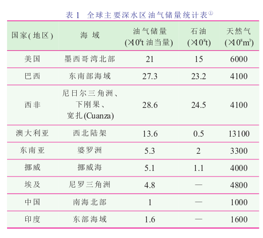 在全球海洋油气探明储量中,目前浅海仍占主导地位,但随着石油勘探技术的进步,人们逐渐将目光转向之前涉足较少的深海。水深小于 500 m 为浅海,大于500m 为深海,1500m 以上为超深海2000~2005 年全球新增油气探明储量164 X0t 油当量.其中深海占 41%.浅海占31%.陆上占28%世界主要深 水区油气储量见表 1。