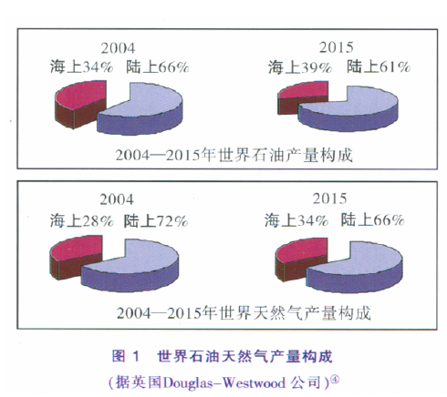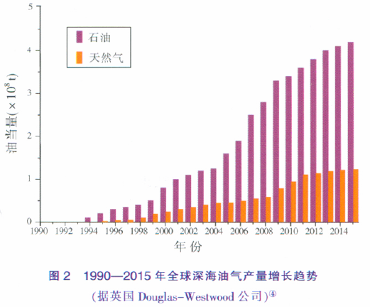 随着海上油气勘探开发向深海转移,全球深海天然气产量也在稳步增长,从1995 年的约 450X0- 油当量增长到 2005年的约 5000X0t油当量,预计2015年将达到 1.25X0t 油当量(图2)