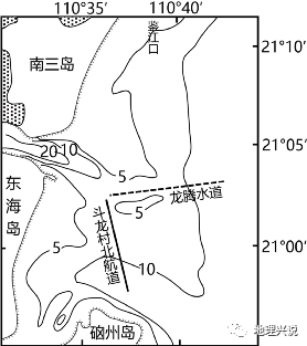 湛江港是全新世中期海侵作用发育起来的、规模较大的溺谷型(由于海平面上升或地壳下降,河口被海水淹没而成漏斗状,称之为溺谷)潮汐汊道,主要由潮流深槽、边缘沙坝等构成,形成典型的潮汐通道地貌体系。该城区波浪主要来自东北方向,对海底地形的塑造产生一定的影响。下图为该区城地理事物及海底等深线(单位:m)分布图。