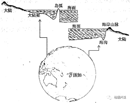 典型例题六:阅读图文资料,完成下列要求。 汤加,为南太平洋岛国,不仅多火山地震,还多海啸。北京时间2022年1月,汤加境内一座海底火山(175.38°W,20.57°S)发生猛烈喷发,引发的海啸形成巨大波纹向外迅速扩散。汤加首都受到海啸严重摧残,斐济、萨摩亚、新西兰、日本等多个国家均发布海啸预警。据称,此次海啸对我国东部地区影响较小。下图为汤加位置及北太平洋东西两侧近岸地貌分布图。 M. h) M1 H% }3 g* @7 }$ ~