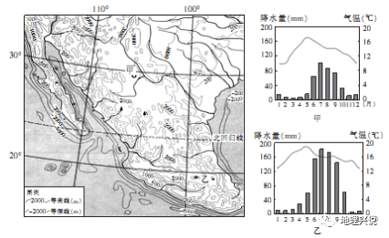 (1)分析图中甲、乙两地年降水量产生差异的原因。 " S" R1 |4 z. i" O0 ]
