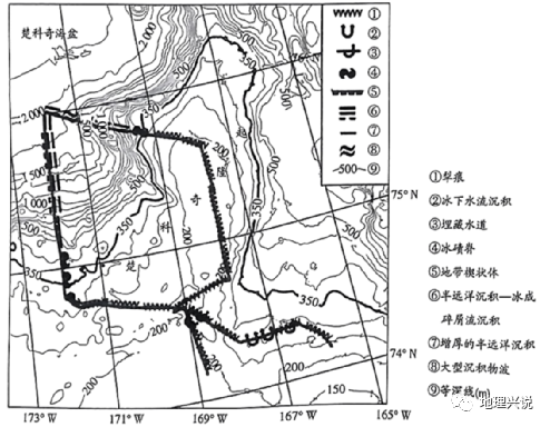 典型例题二:阅读图文材料,完成下列要求。 在第四纪冰期,南、北极地区的冰川活动多次扩展至陆架地区,甚至抵达陆架外缘。楚科奇海是北冰洋边缘海,地处太平洋与北冰洋水体交换的关键位置。第四纪冰期楚科奇浅水海域存在大量的冰川活动下形成的特征性地形(如犁痕、冰脊)和沉积体等,随着后期被海水覆盖而得以保存下来,成为我们认识古冰川作用的重要依据。下图示意楚科奇海海底等深线和主要冰成地貌分布。: X2 V2 h! x2 k