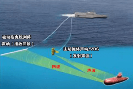 ⑹反潜声呐:下图这个是反潜拖曳阵声呐的示意图,一个是主动声呐,主动发射信号,接收目标反射信号;另一个是被动声呐,只听不发。一般民用声学设备大部分都是主动声呐的一种,被动声呐主要用于军事方面的潜艇伏击或对潜作战。