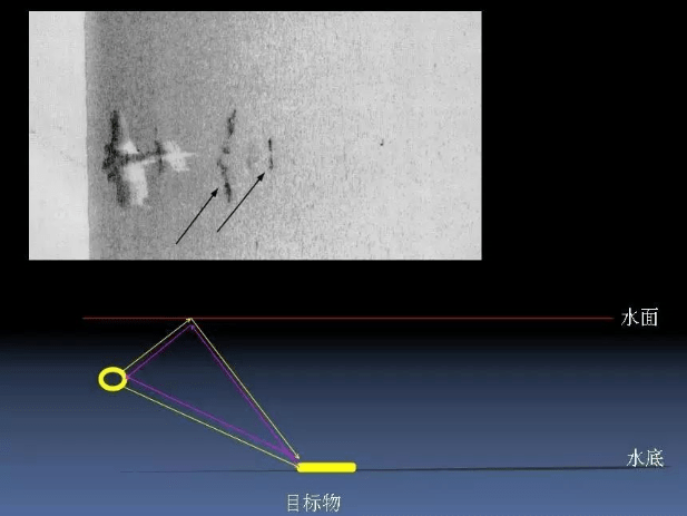 ↑上图是一个海底失事飞机的声呐图像,非常清晰,有强反射,有阴影。白色是正下方的水体盲区,后边还有一个二次反射的图像。主要说明的是镜像反射的案例,平静海况时易出现此类折射回波。 ! c. h. q# I5 |6 j( [4 a, S$ y
