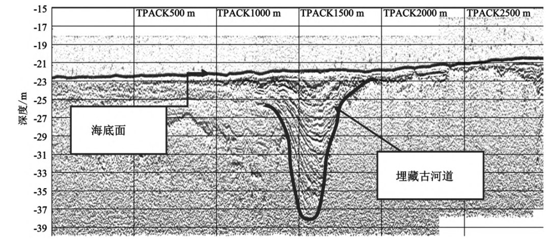 古河道是由于第四纪时期海平面的巨大升降变动而形成,海平面下降近岸陆架裸露成陆地,河流下切侵蚀,当海水再次侵蚀时,河流隐藏在海底,河谷和河床沉积物和两侧岩土性差异,在浅地层剖面记录上可见明显“凹”形反射;工区海域内埋藏古河道发育较好,较多剖面图上存在疑似古河道形态,古河道两侧是倾斜反射结构,底部最大深度约19m(如图4所示);推测测区东南侧有斜层理发育,剖面图上反映为同相轴清晰且连续性好,在倾斜处同相轴错断(如图6所示)。