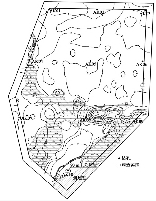 ⑶发现工区海域东南侧(图7)有疑似因历史地质活动而受应力作用发育较为明显的斜层理、“凹”形层理,该层理与上部界面呈角度不整合的接触关系。与该区域相近(距离约400m)的钻孔(AK10)在90m深度内未见基岩层,因此,怀疑该区域基岩埋深变大。斜层理分布区域如图7所示,典型剖面图像如图6所示。 * k- u$ W; ~! w- D8 `' U