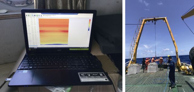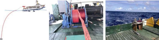 - b3 n3 C1 J3 [, q* y3 m 本课题在海洋先导专项的支持下,为实现大洋中尺度涡、锋面和内波的高精度观测,研发新型的大规模阵列的探测装备,提高立体化海洋环境信息获取和深海探测、取样能力。课题组研发了一套船载拖曳式光纤温深剖面连续测量系统,该系统包含120只温度传感器和压力传感器并集成在拖曳缆中,配合甲板单元的解调设备和绞车系统。温深剖面观测系统随船舶运动实现海面至水下200m温度垂直剖面的高采样频率(1Hz)、高水平分辨率(5节船速水平分率约2.5m)、实时、连续观测。课题组先后攻克了传感器快速响应封装技术、传感器熔接保护技术、工程化解调仪、成链及系统集成技术等,系统测温精度0.01,压力精度0.1%。