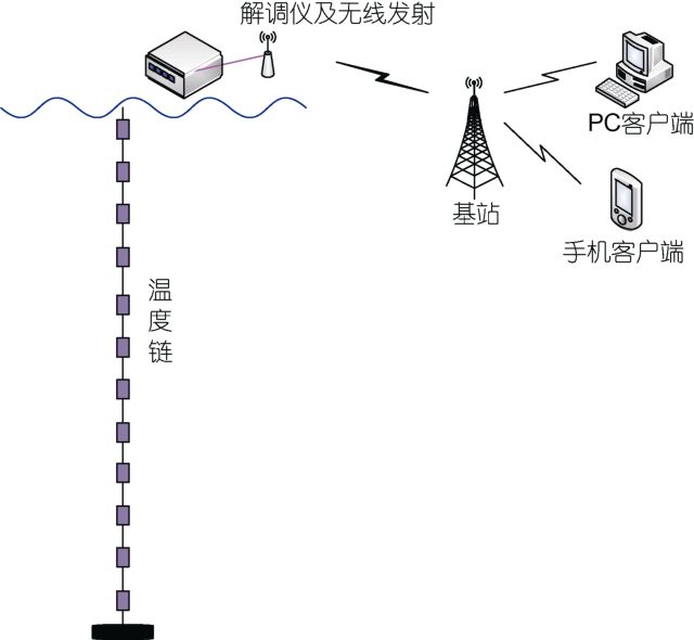 图2 海洋牧场温度链遥测系统示意图 & j$ v$ ?. G( j5 _) b* W9 A/ @0 b