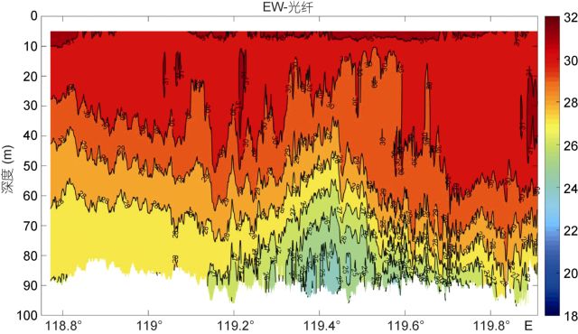 3 v2 p. @2 ^2 E8 Z 海试应用二:本课题于2017年7月在南海北部海域疑似中尺度涡旋附近开展了海试工作。利用光纤温深连续剖面系统,对中尺度涡的温深剖面进行高时空分辨率、高效观测,获取高精细数据结构,助推中尺度涡旋的科学研究。海试所得到的温深剖面如图10、11所示。 ) f0 }$ ~1 R8 \2 u) w