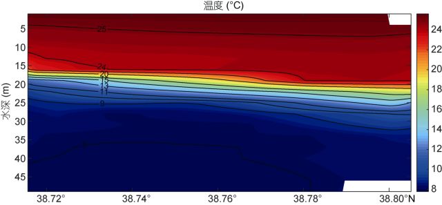 由于本系统的拖曳链具备传感器数量多、间隔小、系统采样率高的特点,相对传统仪器可以更加详细地绘制出冷水团的详细结构。由图9可知,夏季为黄海冷水团鼎盛时期,其北黄海冷水团核心位于38.5°N左右。从图中可以观测到温跃层处的等值线呈倾斜状态,即南部温跃层位置较北部温跃层位置偏浅,且南部温跃层等值线较北部密集,底部存在一个8°C 的闭合冷水核心区。温度链拖曳所获得的海试数据对冷水团有非常高精度和高空间分辨率的观测,对传统海洋学的调查有重要的支撑作用,不仅能够丰富现有的调查手段,也能为科学家分析海洋现象提供高质量的数据,更进一步促进了海洋调查和海洋学研究的发展。