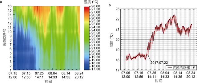 浮台型温度遥测系统经过2016年的试运行后,对暴露的各种工程技术问题如传感器安装、布放、抗扭转、仪表防水、服务器稳定性等方面做了改进,并在2017年7月初下放后, 连续无故障运行至8月底,按照计划于2017年10月底拆除浮台(图3)。
