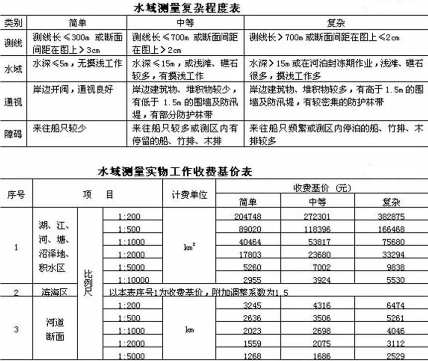 * S f/ o6 v/ a 好了,不谈这些题外的,先说说《工程勘察收费标准》的体系构成。与测绘局《测绘收费标准》相同的是也有该标准也有海区困难类别,水下地形测量依据水域复杂程度收费,分简单、中等和复杂三个部分,对应Ⅰ、Ⅱ、Ⅲ类。不同的是《工程勘察收费标准》里没有那些工资、材料费、运输费、定额工日、班组定员等说明,因为海洋测量本来就是市场行为,你的人员工资等就应该体现在综合报价中。另外,对一个水深测量项目应该去几个人完成这样的事,就没有必要做出硬性规定吧,只要顺利、按质完成项目要求即可。现在都什么年代了,有些水下地形测量项目都采用无人艇作业了,那么你还规定需要几个人才能完成,是不是有些OUT了? 1 M' _% F4 N9 R% D G- v6 `