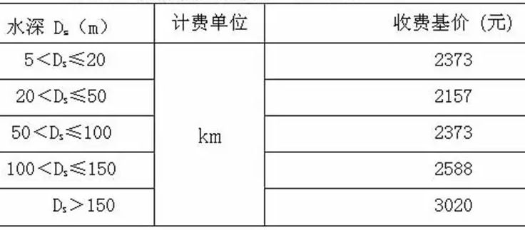 在《工程勘察收费标准》里,除了看2.3节里的“水域测量”部分外,还需要关注第16部分的“海洋工程勘察”部分,该部分对多波束海底地形测量,海底面状况扫侧,底质取样,气象、潮位、波浪观测,海流、盐度、泥沙观测,海洋工程地质钻探,海底地层测量,及其他海洋工程勘察项目,等等都作出了勘察收费依据。这里,海底面状况扫侧是指扫海测量,海底地层测量可以对应浅地层剖面测量。而海底地层测量又细分声学地层探测、单道地震探测及多道地质探测三类。在其他海洋工程勘察项目部分中,地磁观测可以与海洋磁力测量对应,另外还包括沉积物化学、污损生物、水化学等内容。 ( o% P9 I" m4 w0 J- J$ g