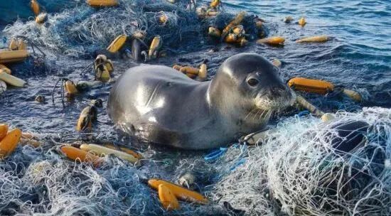 大些的海狗海豹等哺乳类海洋动物被垃圾缠住难以脱身。