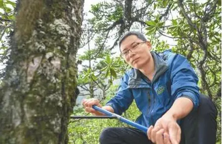 9 c" k5 B. O2 z- p% F; i" s 中科院成都山地所研究员王文志在采集冷杉的年轮样本。