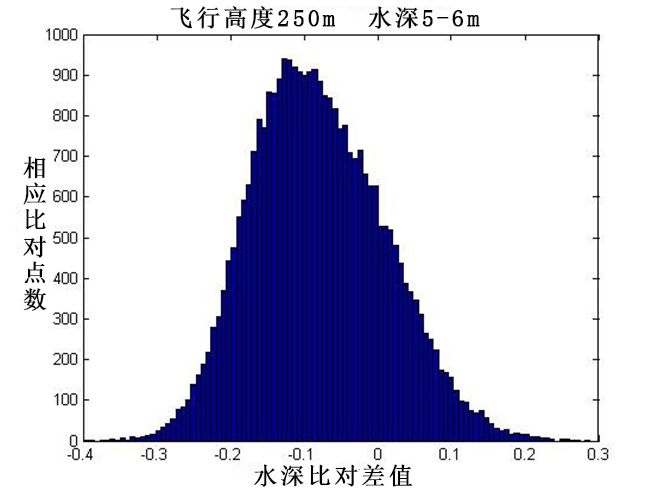 由图4可知, HawkEyeⅡ集的水深数据与多波束测深数据基本吻合。两系统采集的水深数据差呈正态分布,大部分集中在15cm之内,满足国际海道测量标准IHO S-44的测深精度要求。