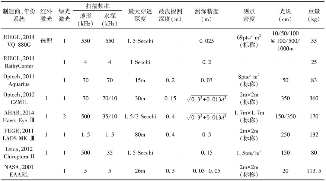 9 p3 C+ J$ |% L 表1 典型机载LiDAR测深系统技术指标比对[11-15]
