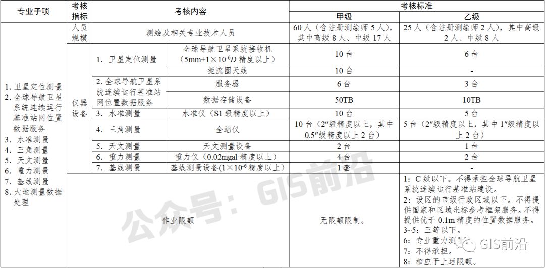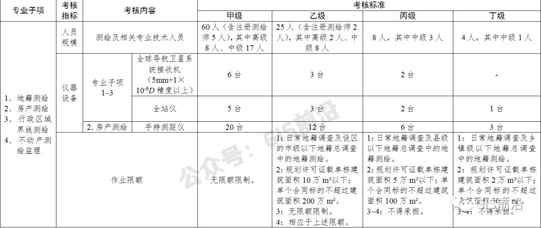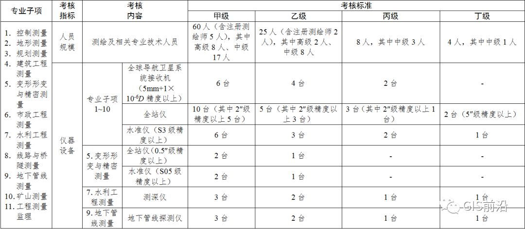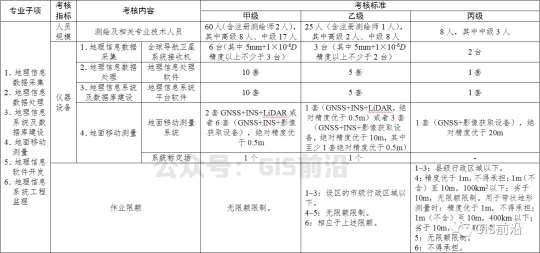 ) z) K& k" E, b9 i 5.自本标准施行之日起满3年后,甲、乙级测绘资质单位的注册测绘师数量应当达到本标准的考核要求。更多干货关注公众号:GIS前沿,自本标准施行之日起满5年后,丙、丁级测绘资质单位也应当具备相应数量的注册测绘师,具体要求另行规定。 l9 J, R$ ]' c) E) i6 Z