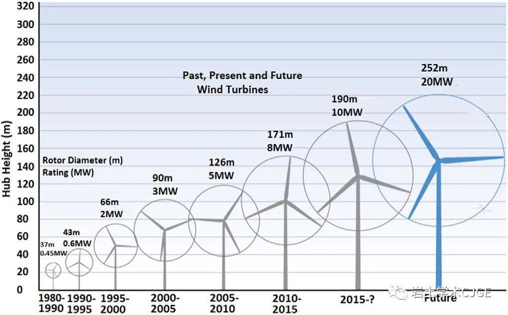* `) }$ r0 w1 @$ u 图2 海上风机单机容量及尺寸的发展 7 c' b/ }0 O) s1 ]- V8 {4 \