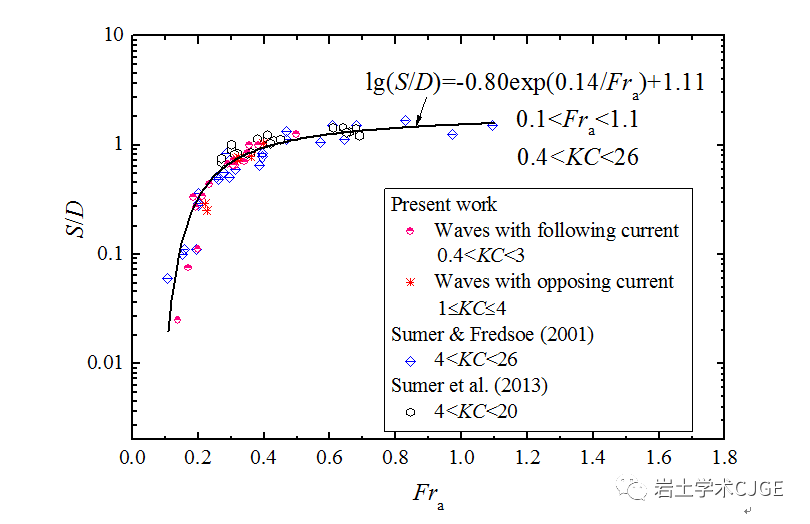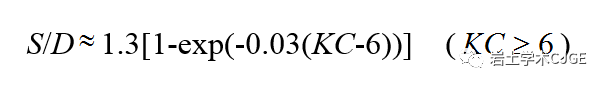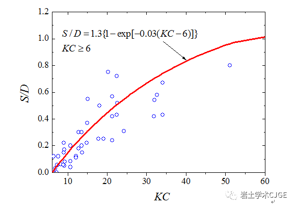 其中S是桩基极限平衡冲刷深度,D为单桩直径;KC数的定义为KC=UwmT/D,其中Uwm为波浪诱导的床面附近水质点流速幅值,T为波浪周期。上式仅适用于单独波浪作用和大KC数(对应小直径单桩)条件,且试验点的分布较为离散,公式预测精度较低(见图3)。 ' `' C3 F, K5 j2 [2 l/ \ b6 w4 t
